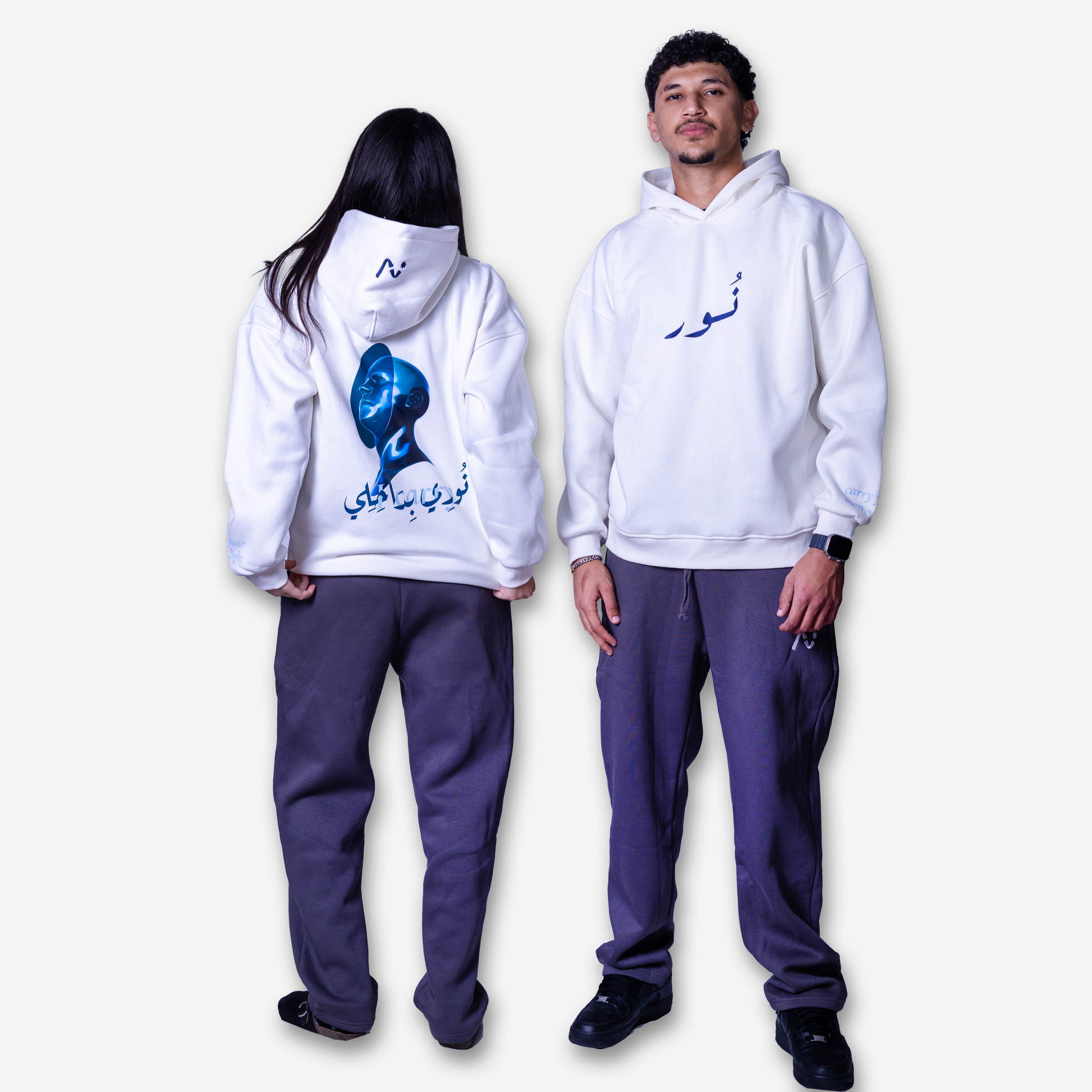 Heavy, lined Melton hoodie featuring front embroidery, a printed back design, and a hood embroidered with an “N” icon. The sleeve is detailed with the text “I CARRY MY OWN LIGHT.”